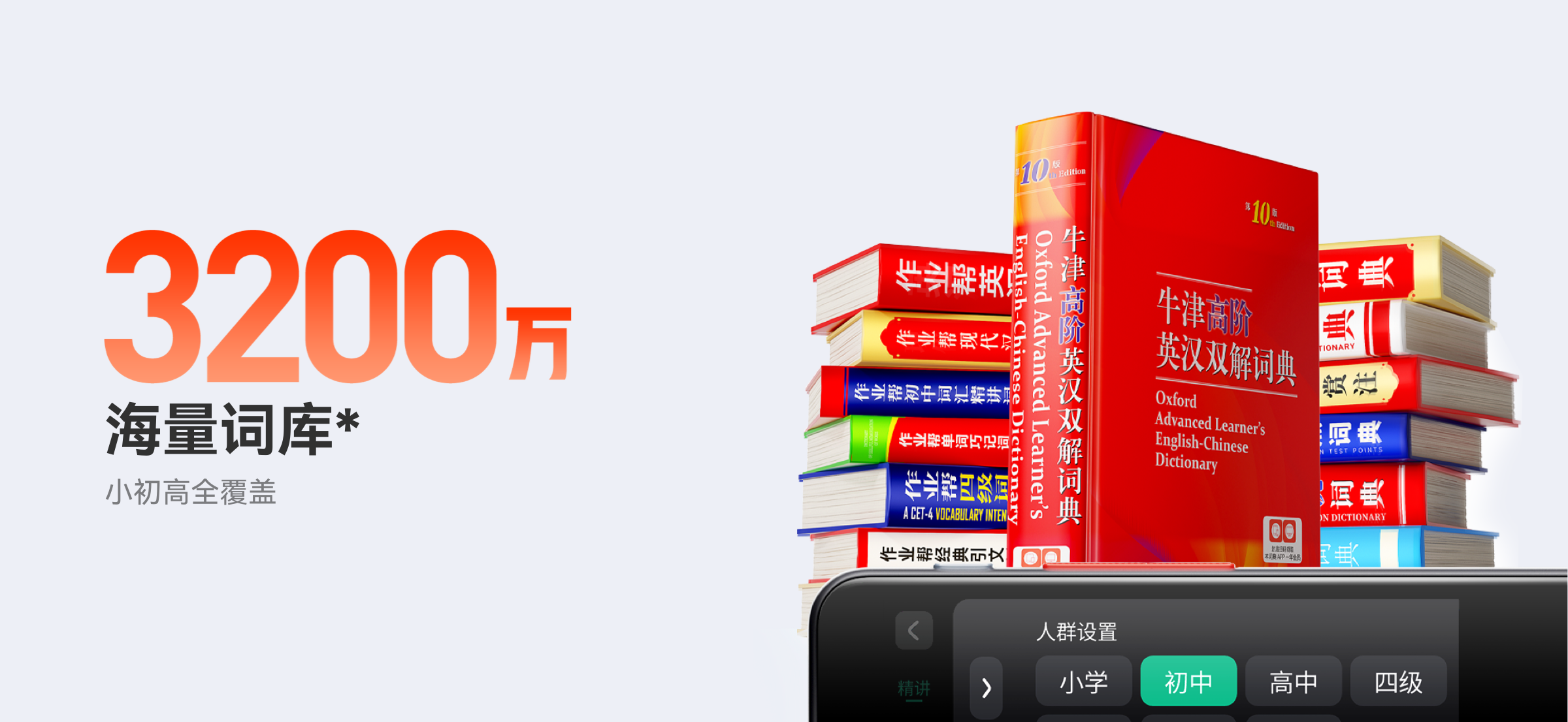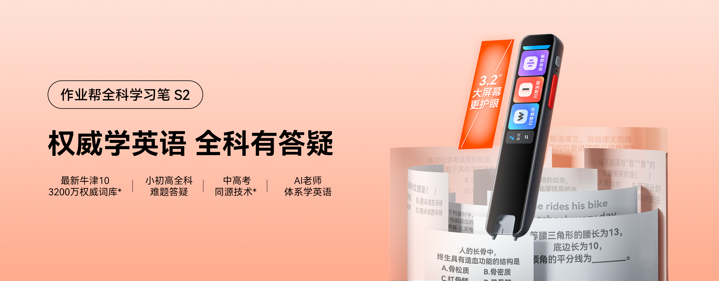 *3200万词库量自于《牛津高阶英汉双解词典(第10版)》(22.8万)、《海词词典加强版》(1200万)、《作业帮学生必备词典》(其中含单词、短语、相关词辨析词条及句子,64万)、《作业帮古诗文词典》(8万),作业帮精品英语题库(1905.2万+,整体英语题库数量1亿+);