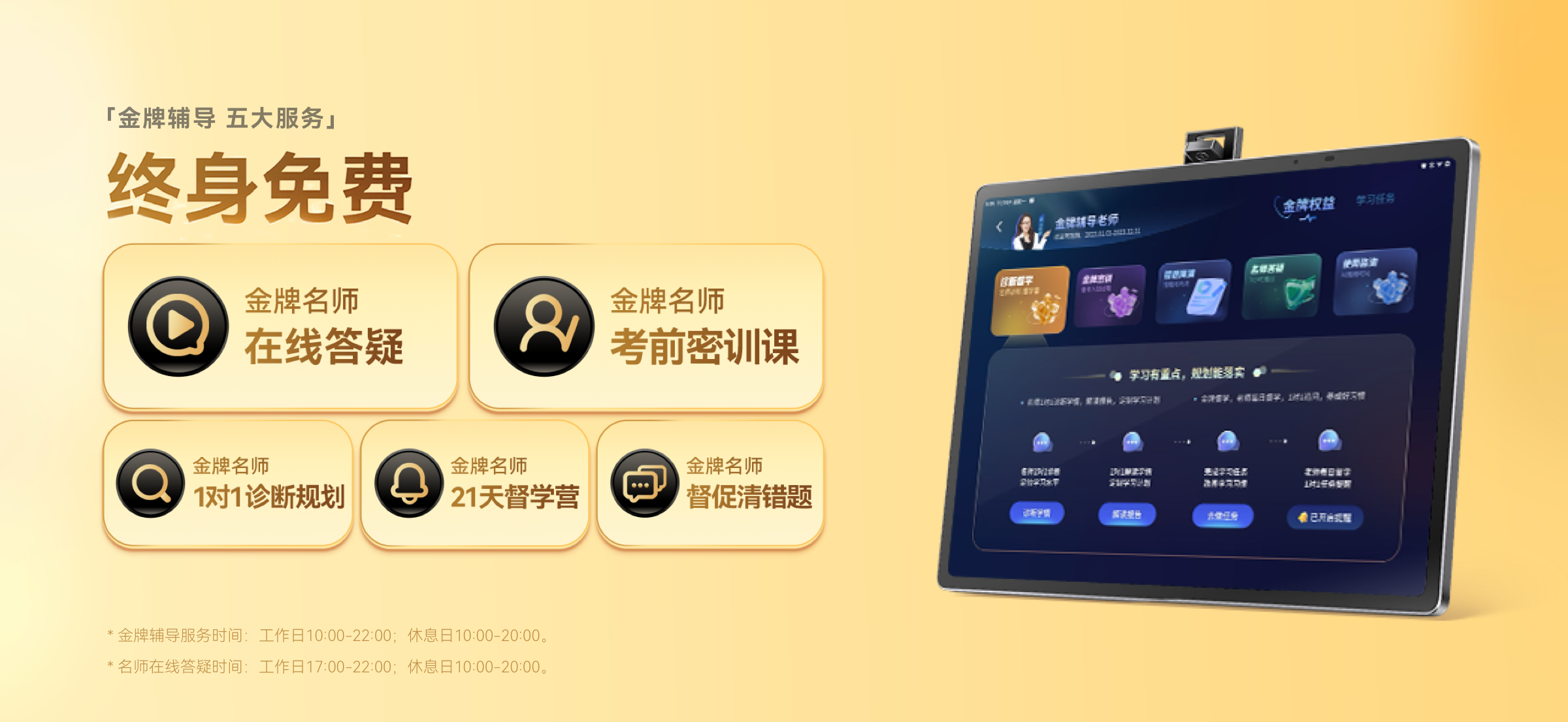 1. 学习机内置资源、课程、学习计划均免费使用,无二次收费,且不定期更新。 2. 金牌服务自设备激活开始生效,内含服务终身免费。目前支持学龄段为1-9年级,按学习机内多账号分别提供金牌服务。服务时间:工作日10:00-22:00;休息日10:00-20:00。 3. 1v1诊断规划功能,每学期一次,目前支持小学语、数、外学科。 4. 添加辅导老师后,辅导老师会主动联系邀请加入21天督学营。 5. 错题周周清功能,目前支持小学数学、初中数学学科;辅导老师每周会推送清错周报、清错计划。 6. 名师答疑服务,可覆盖小学语数外学科、初中语数外学科,主流教辅、试卷真题,更多详情咨询辅导老师;工作时间:工作日17:00-22:00;休息日10:00-20:00;小学学科平均1小时内回复,初中学科平均2小时内回复。如果当天老师不在服务时间内,则顺延到次日辅导老师服务时间内进行反馈。 7. 金牌密训课,为作业帮研发课程,目前支持小学语数外、初中语数外物化学科;形式为持续上线更新,上线节奏为:小学每年级每周4节内容,初中每年级每周6节内容,共计252节课程内容。