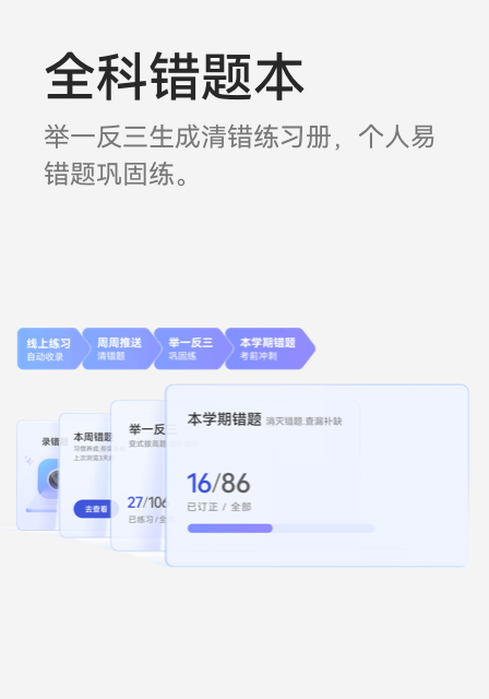 1.《同步天天练》一共118个教材版本,目前支持学科:小学【语数英】,初高中【语数英物化生地政史】。练习册的定价,参考市场主流《同步练习》产品,主流电商网站《五三天天练》31.3元, 《黄冈学霸天天练》49.9元,《名师课堂同步训练》30.88元为样本,按单价30元/册估算。本机内存有:《同步天天练》练习册小学共272册(1册/学期)*30元/册=8160元,初中241册*30元/册=7230元,高中775册*30元/册=23250元,共计38000+元。 2.《必考专项练》目前支持小学【数学】、初中【语数英物化】专项练;难度分层:基础/提升/拔高,适合学生进阶提升; 3.《个人错题练》推练定制练习题为每周五金牌名师推送本周清错报告中的清错计划。